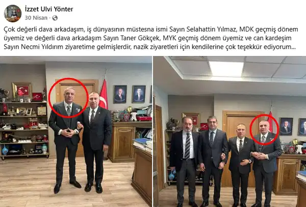 Gözaltına alınan Selahattin Yılmaz’ın MHP yönetimiyle yakınlığını Devlet Bahçeli’nin yanısıra MHP liderinin yardımcısı ve partinin önde gelen isimlerinden İzzet Ulvi Yönter’le fotoğrafı da ortaya koyuyor. Selahattin Yılmaz’ın nisan ayında ziyaret ettiği Yönter, buna ilişkin sosyal medya paylaşımında Yılmaz’ı “Çok değerli dava arkadaşım, iş dünyasının müstesna ismi” ifadeleriyle takdim etmişti.